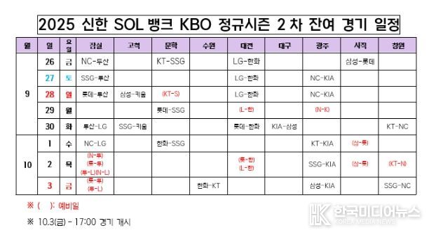 [ 한국미디어뉴스 이원영 기자 ] KBO는 26일(금) 2025 신한 SOL뱅크 KBO 정규시즌 2차 잔여 경기 일정을 확정했다.