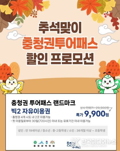 [ 한국미디어뉴스 김풍옥 기자 ] 충청광역연합(연합장 김영환)은 민족 대명절 추석을 맞아 충청권 대표 관광상품 ‘충청권투어패스’의 특별 할인 프로모션을 진행한다고 밝혔다.
