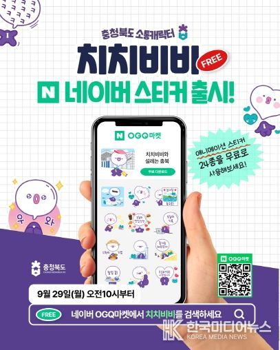 [ 한국미디어뉴스 김풍옥 기자 ] 충북도는 브랜드 소통캐릭터 ‘치치비비와 설레는 충북!’을 주제로, 충청북도의 매력을 담은 애니메이션 스티커 24종을 네이버OGQ마켓을 통해 누구나 무료로 내려받아 즐길 수 있도록 배포한다고 밝혔다.