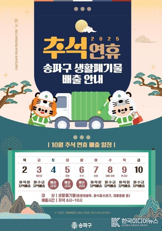 서강석 송파구청장은 “연휴 기간에도 청소상황실과 기동반을 가동해 주민 불편이 없도록 만전을 기하겠다”라며 “특히 10월 4~6일은 생활폐기물 수거가 어려운 만큼, 가정과 사업장에서는 배출을 자제해 주시길 당부드린다”라고 전했다.
