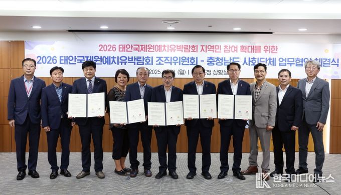 [ 한국미디어뉴스 김서안 기자 ] 2026 태안국제원예치유박람회 조직위원회는 29일 도청 상황실에서 도내 4개 사회단체와 박람회 성공 개최를 위한 협력을 다짐하는 업무협약을 체결했다.
