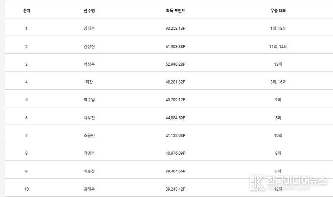 2위 김상현과 10위 김태우(27.(주)하이니스임플란트)의 포인트 격차는 22,659.96포인트다. 또한 10위 김태우와 13위 이승형(22), 17위 김범수(27)와 포인트 차는 각각 10,221.45포인트, 12,766.24포인트다. 10위 김태우와 20위 하충훈(35.㈜일신테크놀로지)와 차이는 16,500.06포인트다.