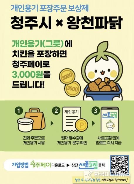 [ 한국미디어뉴스 김풍옥 기자 ] 청주시는 10월 1일부터 ‘새로고침’ 모바일앱을 통해 전국 최초 개인용기 포장주문 보상제를 시행한다. 참여자에게는 지역화폐인 청주사랑상품권(청주페이) 3천원이 보상으로 지급된다.
