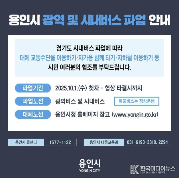 우선 10월 1일 첫차부터 파업이 예고된 노선 중 대체 교통수단 이용이 어려운 처인구와 기흥구를 중심으로 전세버스 30대를 투입한다.