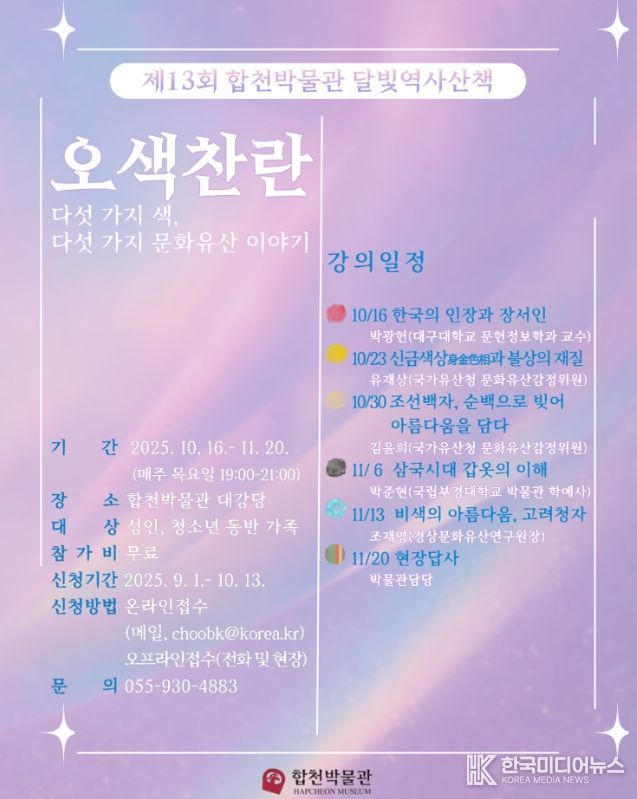 달빛역사산책은 2013년부터 이어져 온 합천박물관의 대표적인 야간 역사문화 강좌로, 지역민들에게 꾸준한 사랑을 받아온 프로그램이다. 올해는 ‘오색찬란 – 다섯 가지 색, 다섯 가지 문화유산 이야기’를 주제로 한국 문화유산 속 다섯 가지 색을 중심으로 역사․미술․고고학 분야 전문가들이 강연을 펼치며, 색을 매개로 문화유산의 의미를 새롭게 조명한다.