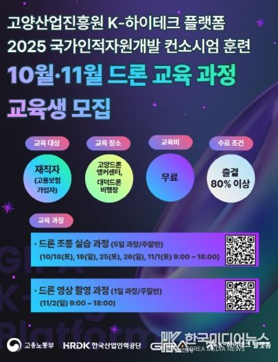 [ 한국미디어뉴스 문상수 기자 ] 고양산업진흥원 K-하이테크플랫폼지원단이 고용노동부와 한국산업인력공단이 주관하는 국가인적자원개발 컨소시엄 사업의 일환으로, 드론·생성형 AI 교육과정 교육생을 모집한다고 밝혔다.