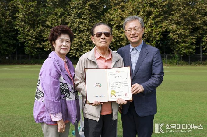 [ 한국미디어뉴스 이보영 기자 ] 구로구가 9월 30일 고척동 계남근린공원 인조잔디축구장에서 14년간 자원봉사자로 활동한 이수영 어르신에게 감사장을 전달했다.
