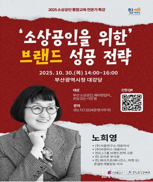 [ 한국미디어뉴스 이원영 기자 ] 부산시는 오는 10월 30일 오후 2시 시청 대강당에서 개최되는 '2025년 하반기 소상공인 전문가 특강' 참가 접수를 오늘(1일)부터 시작한다고 밝혔다.