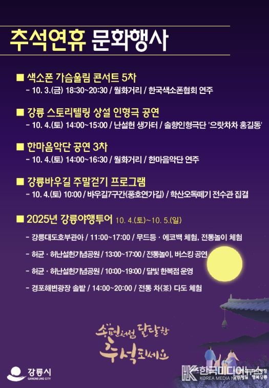아울러 달빛따라 걷는 강릉야행투어가 4일부터 5일까지 강릉대도호부관아, 허균·허난설헌기념공원, 경포해변광장 솔밭에서 운영되며, 전통놀이와 절식 체험, 버블 공연과 퓨전 국악, MZ세대 버스킹 등 다양한 문화공연이 펼쳐진다.
