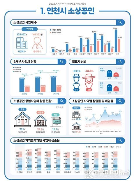 [ 한국미디어뉴스 이원영 기자 ] 인천광역시는 '2023년 기준 인천 소상공인통계'결과를 인천시 누리집 인천데이터포털을 통해 공표했다고 밝혔다.