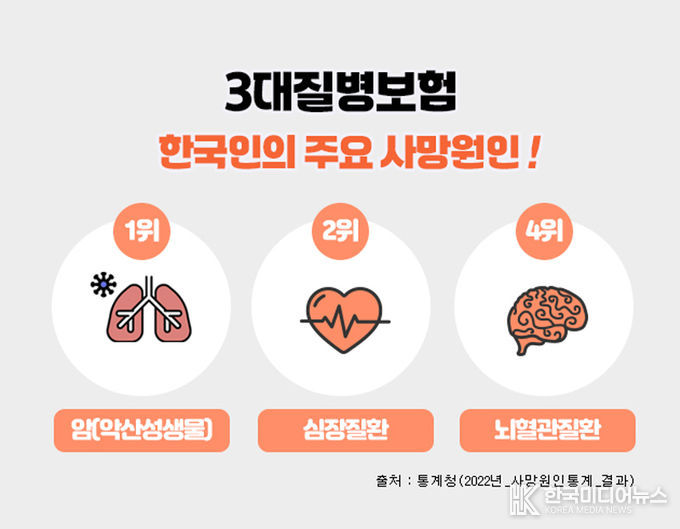 [ 한국미디어뉴스 이원영 기자 ] 3대질병으로 일컬어지는 암, 뇌혈관질환, 심혈관질환은 한국인의 주요 사망원인에서 상위를 차지하고 있으며, 이에 대한 진단비를 집중적으로 보장해 주는 보험상품을 3대질병진단비 보험이라 할 수 있다.