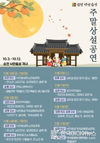 [ 한국미디어뉴스 이종철 기자 ] 순천시는 순천 낙안읍성에서 '주말 상설공연'과 '김빈길 장군 창극' 공연을 오는 10월 3일부터 12일까지 선보인다고 밝혔다.