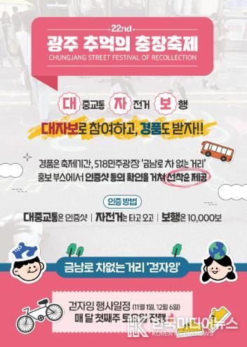 [ 한국미디어뉴스 이종철 기자 ] 광주 동구는 오는 15일부터 5일간 금남로와 충장로 일원에서 열리는 제22회 광주 추억의 충장축제에서 ‘금남로 차 없는 거리’의 가치를 알리고 대자보 도시 정책에 시민 참여를 확대하기 위한 특별 홍보 이벤트를 진행한다고 밝혔다.