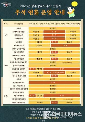 이승규 신활력추진본부장은 “광주에는 북적이는 관광지가 아니더라도 조용하고 매력적인 숨은 명소가 많다”며 “추석 연휴 시민과 관광객들이 광주의 가을 정취 속에서 여유롭고 풍성한 명절을 보내시길 바란다”고 말했다.