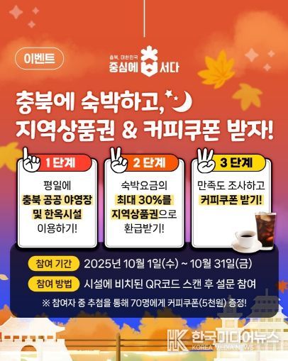 만족도 조사는 10월 1일부터 10월 31일까지 가을 행락철 기간동안 진행된다. 충북도는 이를 통해 관광객의 생생한 의견을 수렴하고 사업 운영 전반을 보완·개선하여, 충북이 머무르고 싶은 관광지로 자리매김할 수 있도록 정책을 이어갈 계획이다.
