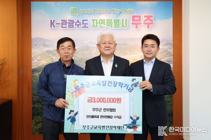 [ 한국미디어뉴스 이종철 기자 ] 무주군 한우협회 회원들이 지난 1일 무주군교육발전장학재단(이사장 무주군수 황인홍)에 장학금 3백만 원을 기탁했다.