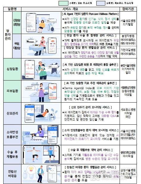 ‘의료AI 혁신 생태계 조성(닥터앤서3.0)’ 사업은 환자가 일상으로 복귀한 이후에도 주도적으로 예후를 관리할 수 있도록 AI가 돕고, 응급상황 시 의료진이 적시에 개입할 수 있도록 지원하는 서비스 개발‧실증 사업이다. 당초 ’25년도 예산 규모(23억원)에 따라 유방‧신장암, 심장질환 등 4종의 재활‧만성 질환을 선정했으며, 하반기 추경(40억원 증)을 계기로 위암‧대장암, 산모 질환 등 6종의 질환을 추가 선정하여 총 10종 질환에 특화된 AI 예후 관리 서비스를 개발한다.