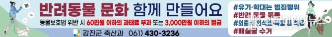 강진군 관계자는 “모든 주민이 함께 안전하고 행복한 생활을 영위할 수 있도록, 성숙한 반려동물 문화조성에 적극 동참하여 주길 바란다”고 당부했다.