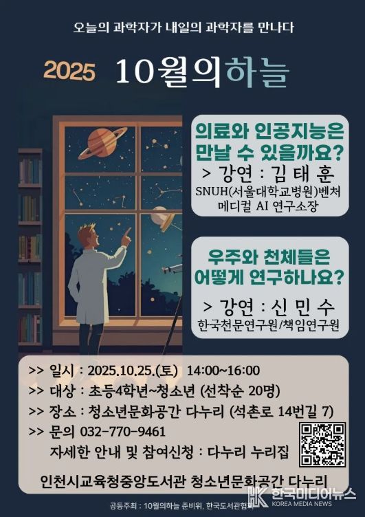 [ 한국미디어뉴스 이원영 기자 ] 인천광역시교육청중앙도서관 청소년문화공간 다누리는 10월 25일 토요일 오후 2시 청소년을 대상으로 과학자들의 재능기부 강연 프로그램 ‘10월의 하늘’을 개최한다.