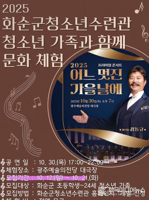 [ 한국미디어뉴스 이종철 기자 ] 화순군은 2일 청소년수련관에서 짙어가는 가을의 정취 속에 청소년과 가족이 함께하는 특별한 문화체험, 바리톤 김동규의 프리미엄 콘서트'어느 멋진 가을날'을 관람할 청소년 가족 60명을 선착순 모집한다고 밝혔다.