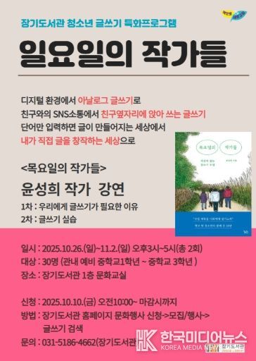 [ 한국미디어뉴스 이원희 기자 ] 김포시 장기도서관은 청소년 글쓰기 특화프로그램으로 '일요일의 작가들'을 오는 10월 26일, 11월 2일 오후 3시부터 5시까지 장기도서관 1층 문화교실에서 운영한다고 밝혔다