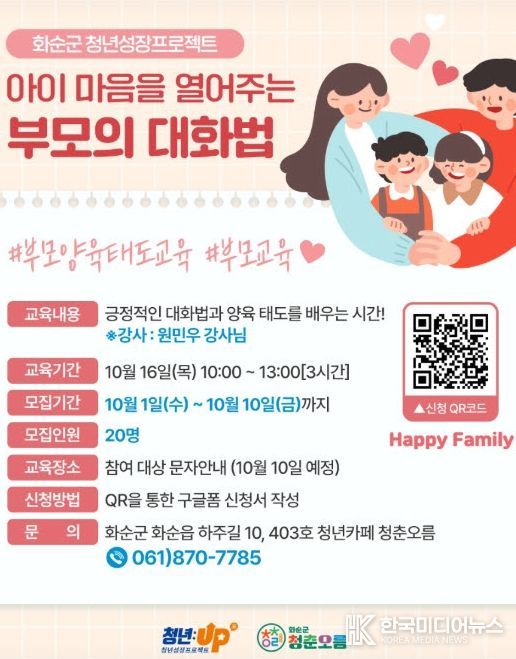 [ 한국미디어뉴스 이종철 기자 ] 화순군은 2일 청년성장 프로젝트 공모사업의 일환으로 개인별 맞춤형 부모 교육 프로그램을 진행한다고 밝혔다.