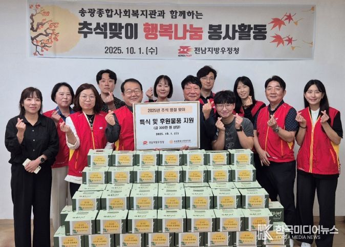 [ 한국미디어뉴스 이종철 기자 ] 전남지방우정청은 지난 1일 추석 명절을 맞아 광산구 소재‘송광종합사회복지관’을 방문하여 배식 봉사활동 및 후원물품 전달행사를 진행했다고 밝혔다.