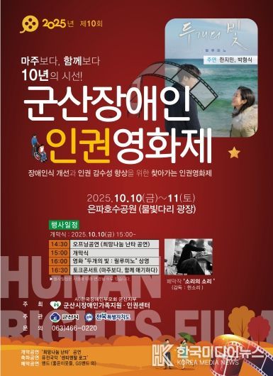 [ 한국미디어뉴스 이종철 기자 ] 군산시 장애인가족지원인권센터가 10월 10일부터 11일까지 은파호수공원 물빛다리 광장에서 군산시민을 대상으로 장애인 인식개선 및 인권의식 함양을 위한 2025년 제10회 군산장애인인권영화제를 개최한다.