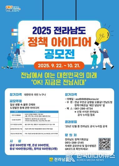 [ 한국미디어뉴스 이종철 기자 ] 전라남도가 새 정부의 실용주의 기조에 맞춰 ‘생활 속 불편을 찾고 이를 개선할, 지역의 미래를 먹여 살릴 정책’을 주제로 ‘2025년 전라남도 정책 아이디어 공모전’을 개최한다.