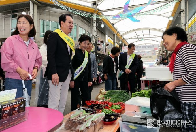 3일, 송 군수는 괴산전통시장 곳곳을 돌며 제철 농산물과 수산물 등을 직접 구입하고, 상인들과 일일이 악수하며 현장의 생생한 목소리를 청취했다.