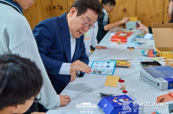 이어 명절을 맞아 딱지, 팽이 등 전통 장난감 만들기 체험을 하고 있던 아이들을 만난 이재명 대통령은 아이들과 일일이 하이파이브를 하며 인사를 나누고, 놀이를 함께했다.