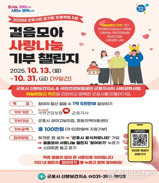 [ 한국미디어뉴스 이보영 기자 ] 군포시 산본보건지소는 오는 10월 13일부터 31일까지(19일간) 국민건강보험공단 군포지사와 함께하는 '걸음모아 사랑나눔' 기부챌린지를 운영한다.