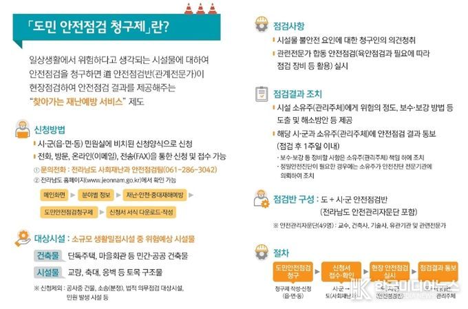 [ 한국미디어뉴스 이종철 기자 ] 전라남도는 각종 재난으로부터 도민의 생명과 재산을 보호하고 일상 생활주변에 불안전한 위험요소를 찾아 무료로 안전점검하는 ‘도민 안전점검 청구제’를 운영하고 있다고 밝혔다.