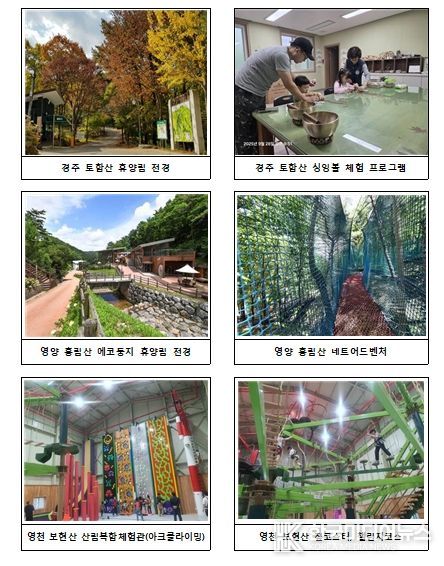 상주 성주봉자연휴양림은 가족들이 자연과 목재를 직접 접하며 특별한 추억을 쌓을 수 있는 목공예 체험과 숲 해설 프로그램, 경주 토함산자연휴양림은 싱잉 볼 체험, 목공예 체험·목재 놀이 등 다채로운 프로그램이, 영천 보현산자연휴양림은 산림 레포츠, 명상 치유, 목공예 체험 등 다양한 활동이 마련되어 있다.