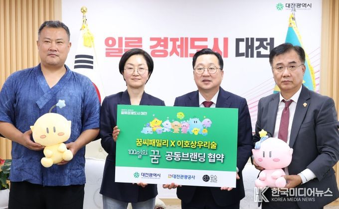 [ 한국미디어뉴스 이보영 기자 ] 대전시는 10일 시청 응접실에서 대전관광공사, 우리술협동조합과 함께 공동브랜딩 업무협약을 맺고, 대전 대표 캐릭터 꿈돌이를 적용한 프리미엄 전통주 ‘100일의 꿈’을 출시한다고 밝혔다.