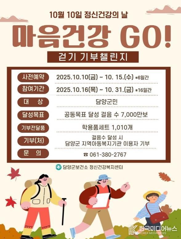 [ 한국미디어뉴스 이종철 기자 ] 담양군은 10월 10일 ‘세계 정신건강의 날’을 맞이하여 전 군민을 대상으로 걷기 기부 챌린지를 운영한다고 밝혔다.