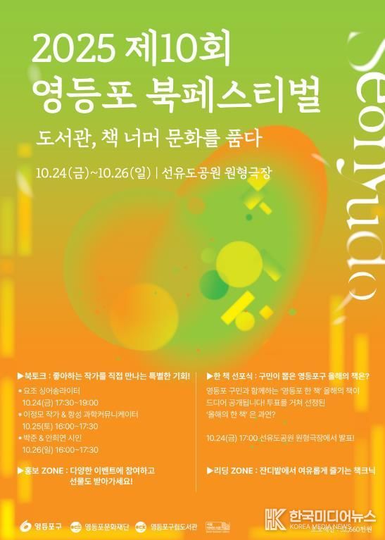 한편 오는 10월 24일부터 26일까지 선유도공원에서 ‘제10회 영등포 북페스티벌’이 열린다. 이번 축제는 영등포 대표 지역축제인 ‘선유도원 축제’와 연계해 진행되며, 선선한 가을 바람 속에서 특별한 독서의 즐거움을 느낄 수 있다. 자세한 사항은 구청 미래교육과 또는 영등포구립도서관으로 문의하면 된다.