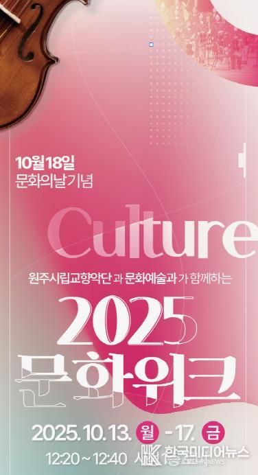 [ 한국미디어뉴스 이원영 기자 ] 원주시와 원주시립교향악단은 10월 18일 ‘문화의날’을 기념해, 10월 13일부터 17일까지 ‘2025 문화위크’를 운영한다.
