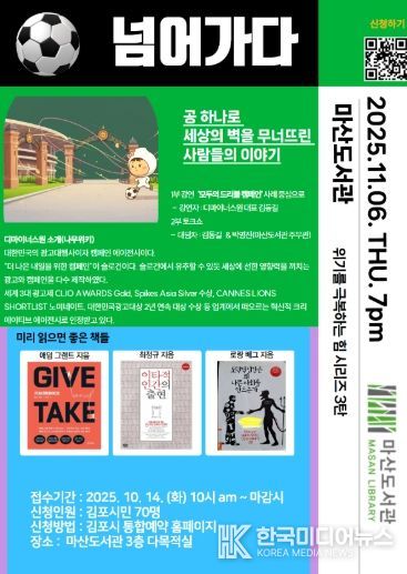 [ 한국미디어뉴스 이원희 기자 ] 마산도서관은 오는 11월 6일 19시, 본관 3층 다목적실에서 ‘공 하나로 세상의 벽을 무너뜨린 사람들의 이야기’ 프로그램을 운영한다고 밝혔다.