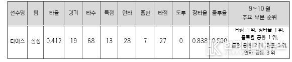 9~10월 MVP로 선정된 디아즈에게는 상금 300만원과 트로피가 전달될 예정이다.
