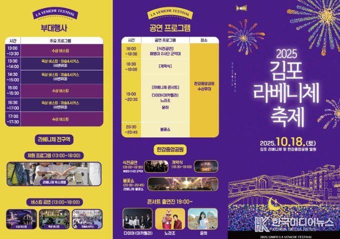 [ 한국미디어뉴스 이원희 기자 ] 대한민국의 베니스 ‘라베니체’를 100% 즐길 수 있는 ‘2025 김포 라베니체 축제’가 오는 18일 한강중앙공원과 라베니체 일원에서 열린다. K-드라마 성지이자 대한민국 대표 야간명소로 이름난 라베니체에서 수상버스킹과 불꽃쇼를 동시에 즐길 수 있는 1년에 단 하루 열리는 축제다.