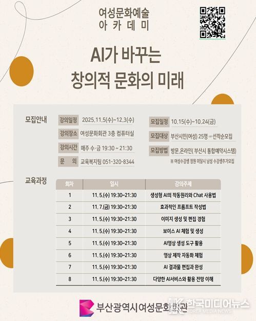 [ 한국미디어뉴스 이원영 기자 ] 부산시 여성문화회관은 오는 11월 5일부터 12월 3일까지 '에이아이(AI)가 바꾸는 창의적 문화의 미래'를 주제로 '2025년 여성 문화예술 아카데미'를 운영한다고 밝혔다.