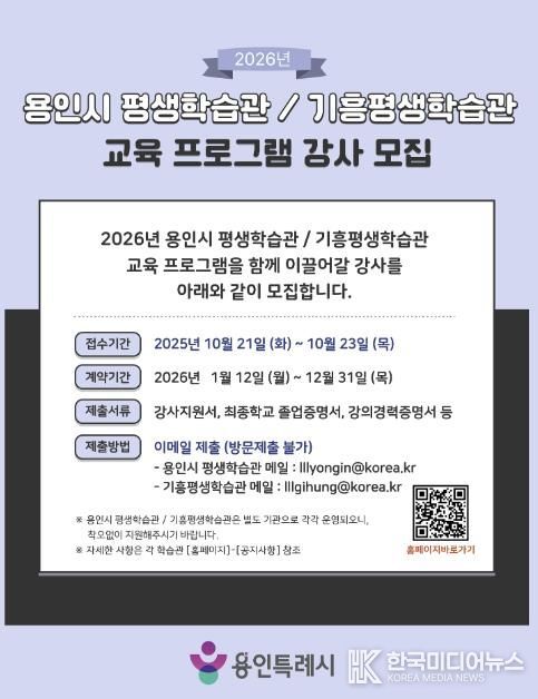 [ 한국미디어뉴스 이원영 기자 ] 용인특례시는 21일부터 23일까지 3일간 ‘2026년 평생학습관 프로그램’을 운영할 강사를 모집한다고 15일 밝혔다.