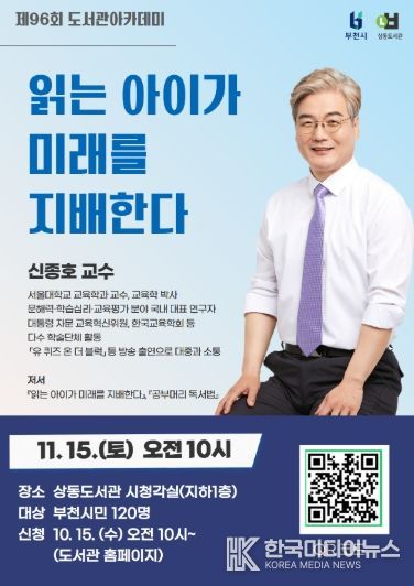 [ 한국미디어뉴스 김만길 기자 ] 부천시는 11월 15일 오전 10시 부천시립상동도서관 시청각실에서 인공지능(AI)·디지털 시대 학습 경쟁력의 핵심인 문해력을 주제로 ‘제96회 도서관 아카데미’를 연다. 이번 강연은 ‘읽는 아이가 미래를 지배한다’의 저자이자 서울대학교 교육학과 교수인 신종호 교수를 초청해 진행한다.
