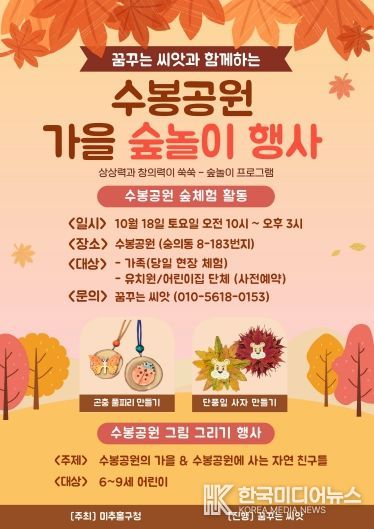 구 관계자는 “이번 가을 숲 놀이 행사를 통해 가족이 함께 가을의 정취를 느끼며 소중한 추억을 쌓고, 아이들은 자연 속에서 배우고 성장하는 뜻깊은 시간을 보내길 바란다.”라고 말했다.
