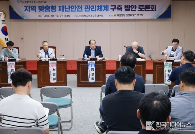 [ 한국미디어뉴스 이종철 기자 ] 전라남도의회 의원 연구단체인'재난안전 선진화 방안 연구회'는 지난 10월 15일 전라남도의회 초의실에서 강정일 대표의원(광양2) 주재로 ‘지역 맞춤형 재난안전 관리체계 구축 방안’에 대한 토론회를 개최했다.