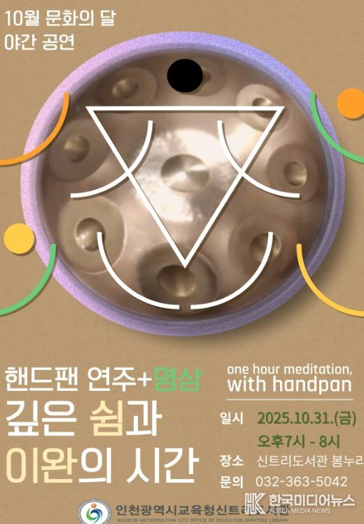 [ 한국미디어뉴스 이원영 기자 ] 인천광역시교육청신트리도서관은 10월 문화의 달을 맞아 ‘쉼과 이완이 있는 핸드팬+명상 공연’을 10월 31일 오후 7시부터 8시까지 신관 1층 봄누리에서 개최한다.