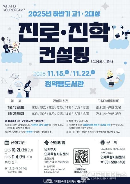 [ 한국미디어뉴스 김서안 기자 ] 남양주시는 오는 21일부터 ‘2025년 하반기 진로·진학 컨설팅’참가자를 모집한다고 밝혔다.