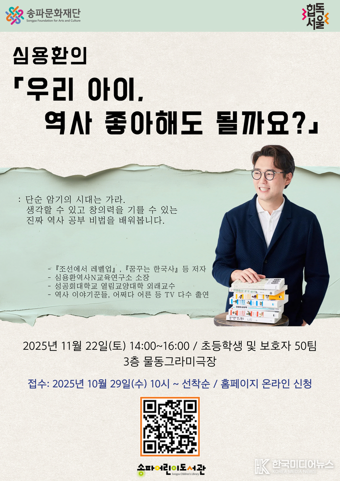 [ 한국미디어뉴스 이원영 기자 ] 송파문화재단(대표 이동근) 소속 송파어린이도서관에서 오는 11월 22일(토) 오후 2시 역사학자 심용환과 함께 [우리 아이, 역사 좋아해도 될까요?]란 주제로 강연을 개최한다.