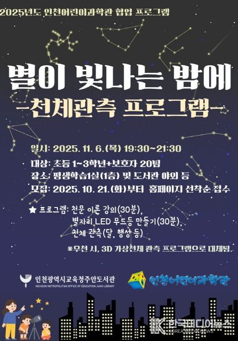 이번 프로그램은 지난해 체결된 인천어린이과학관과의 업무협약에 따라 진행되는 협업 사업으로, 11월 6일 오후 7시 30분부터 9시 30분까지 주안도서관 평생학습 1실과 야외에서 진행된다.
